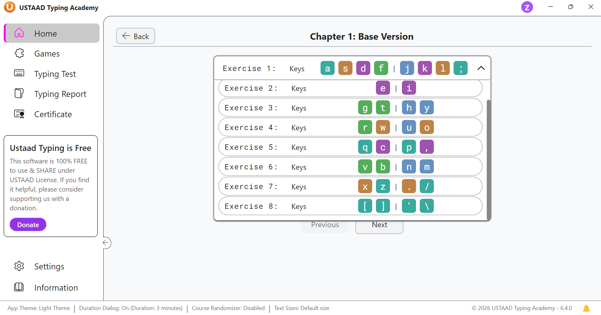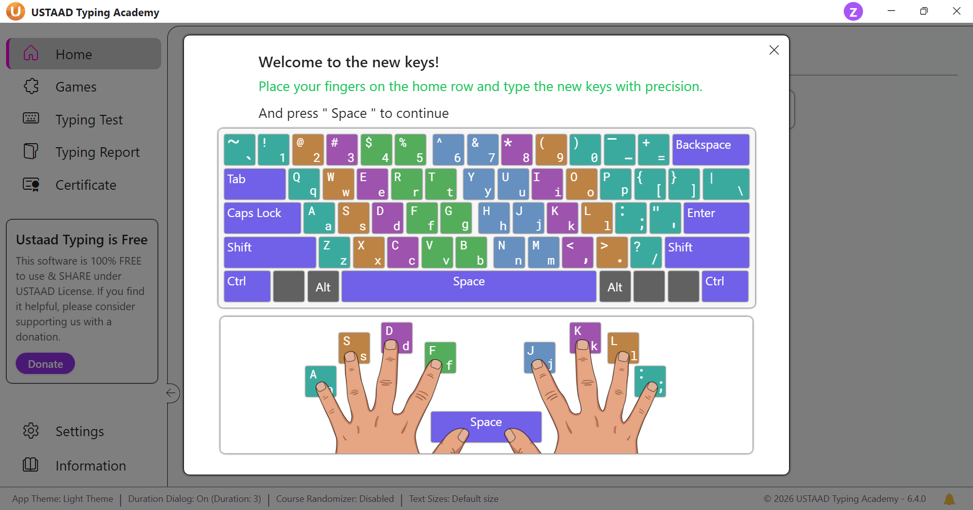 - Keys Practice — Focus on accurate individual keystrokes and home row discipline