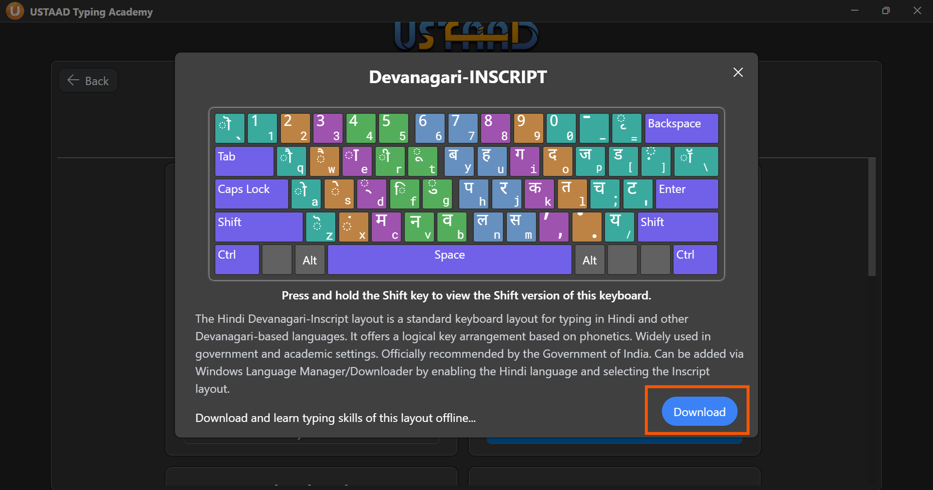 Hindi typing courses are available inside USTAAD and can be downloaded when needed.