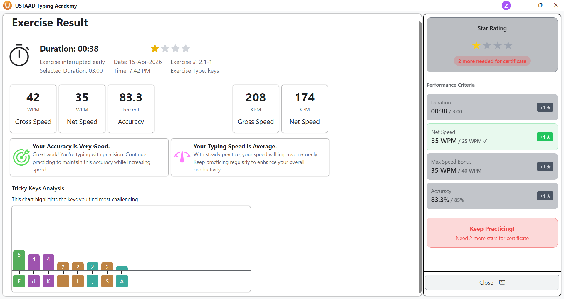 • Certificate requirement: Typing results are mandatory for certificate eligibility, so consistent 30+ second sessions are essential.