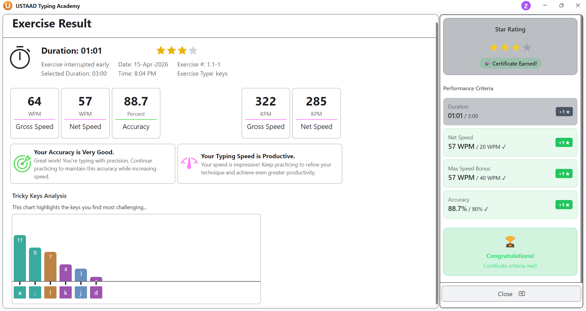 This guide explains how to view and understand lesson-level typing results in USTAAD Typing Academy. Results are essential for tracking progress, earning certificates, and identifying areas for improvement.