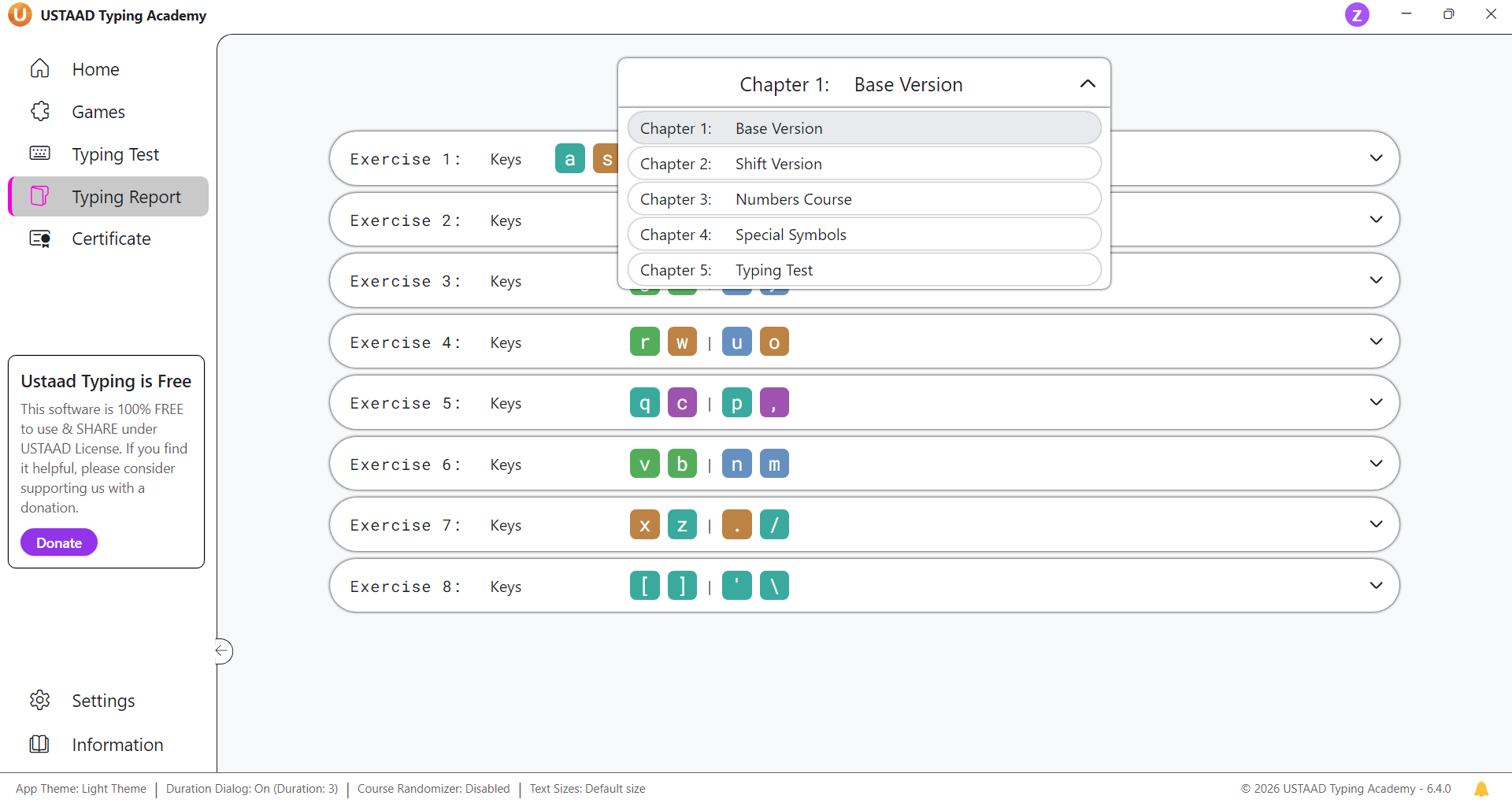 At the top, a chapter title dropdown lets you choose from all available typing chapters and exercise titles.
